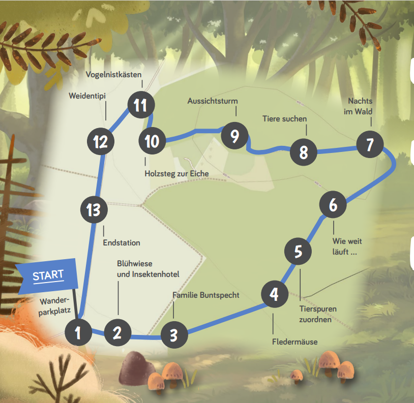 An 13 Stationen erfährst du Spannendes über den Wald und seine Bewohner. Der Erlebnisweg ist ein ca. 1,5 Kilometer langer Rundwanderweg. Der Weg ist nicht für Kinderwagen geeignet.
