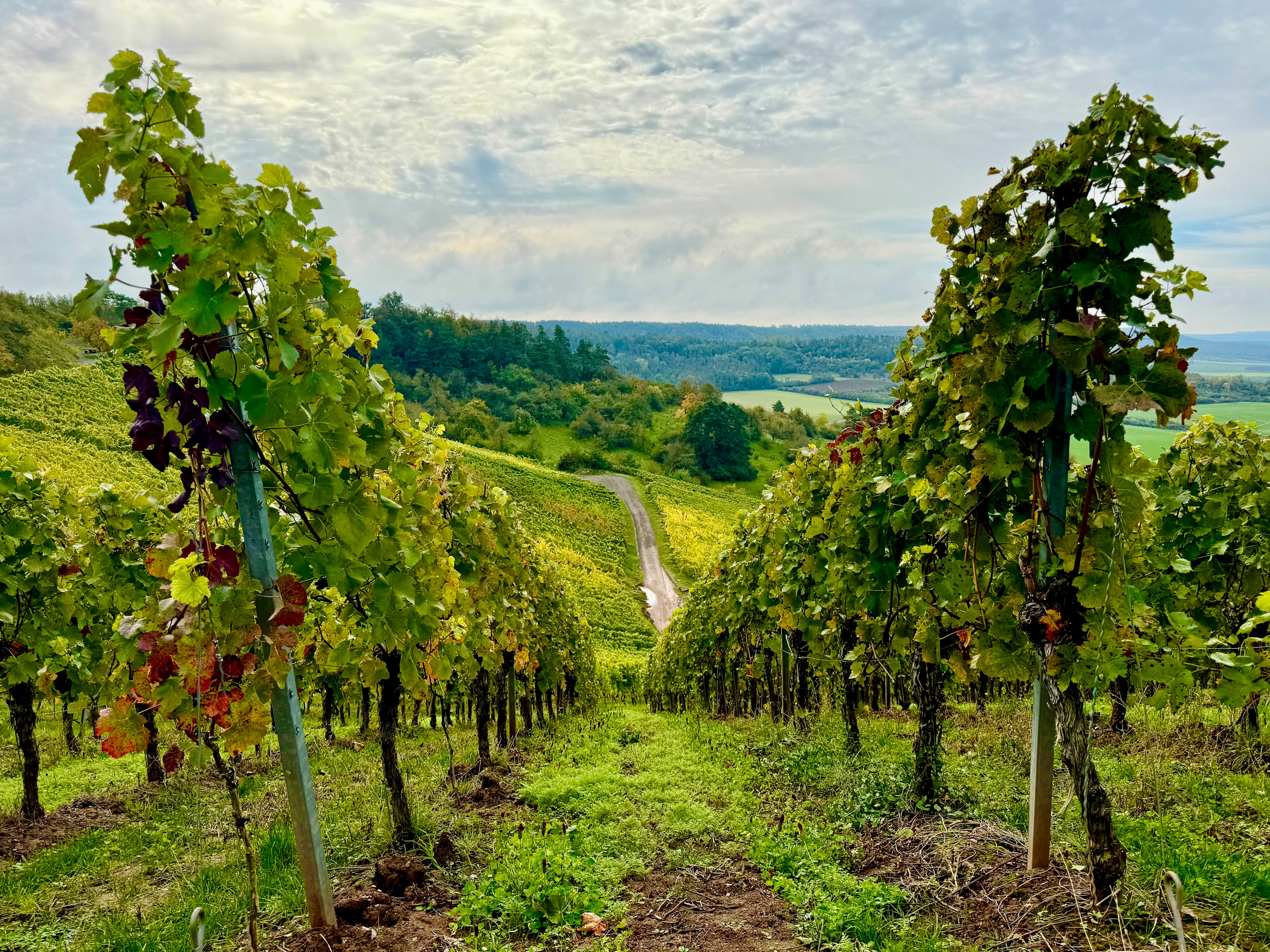 Der Weinparadiesweg entführt durch eine malerische Landschaft aus sanften Weinbergen und schattigen Wäldern.